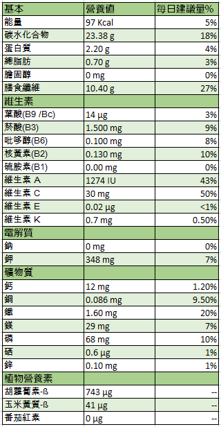 Passion fruit (Passiflora edulis), 鮮果,百香果每100g的可食用部分 (紫色百香果,含果漿及種仔) 百香果美味,含有豐富的抗氧化劑,礦物質,維生素和膳食纖維。每100克可食用部份中含有約97卡路里的熱量。
